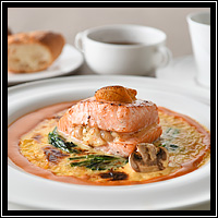 秋野菜とつぶ貝のサーモンファルシグラタン仕立て
